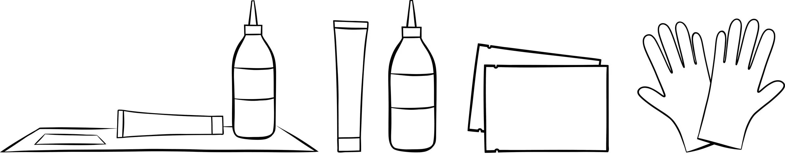 Below is the illustrations I completed of the kit contents including the Rich Cream Colourant, Developer Bottle, Barrier Gel, Eraser Wipe and Gloves.